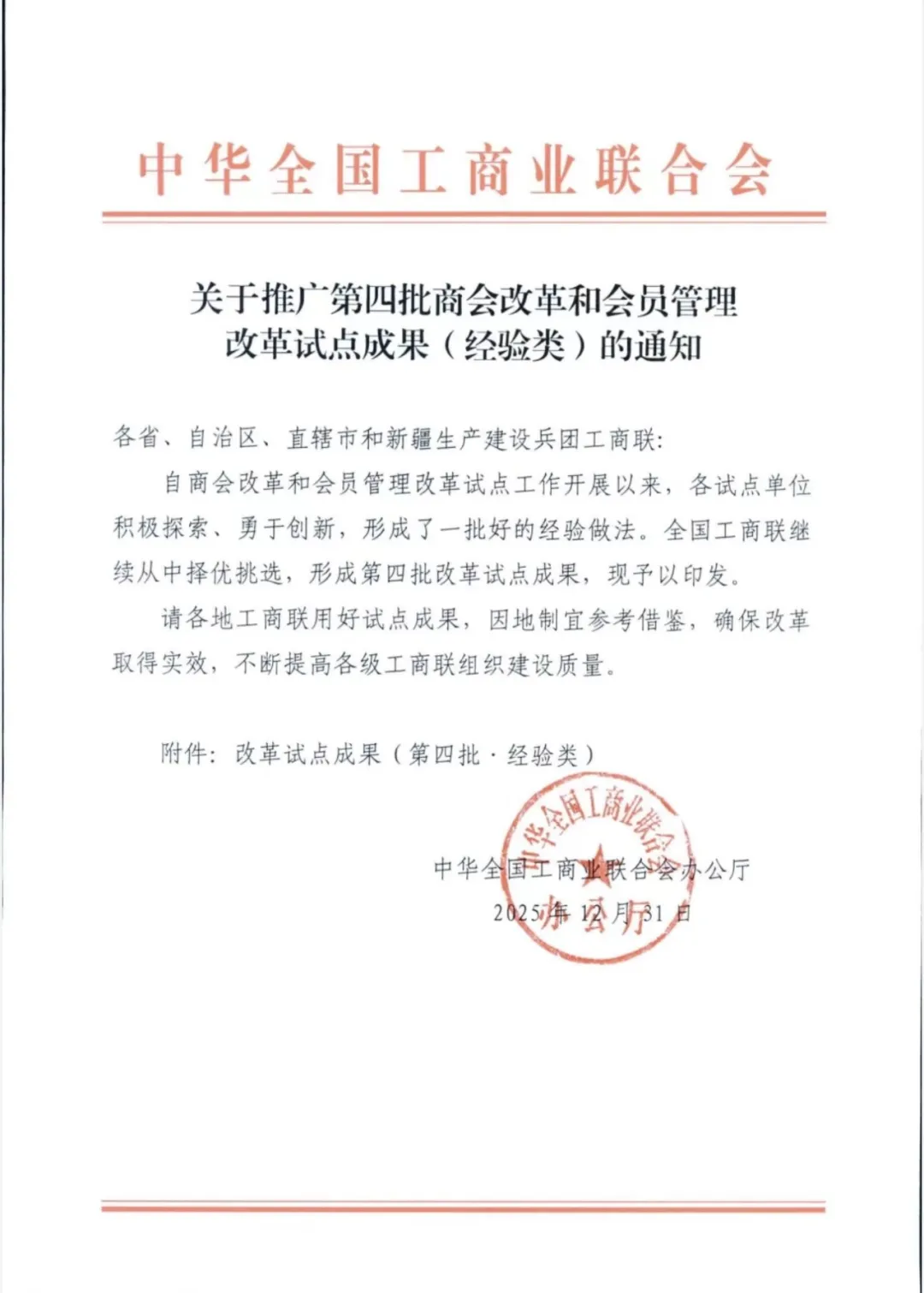 近日,全国工商联印发《关于推广第四批商会改革和会员管理改革试点成果(经验类)的通知》,通化市工商联申报的“聚力品牌商会建设 激活‘两个健康’发展动能”经验做法成功入选,试点经验获全国工商联的肯定。