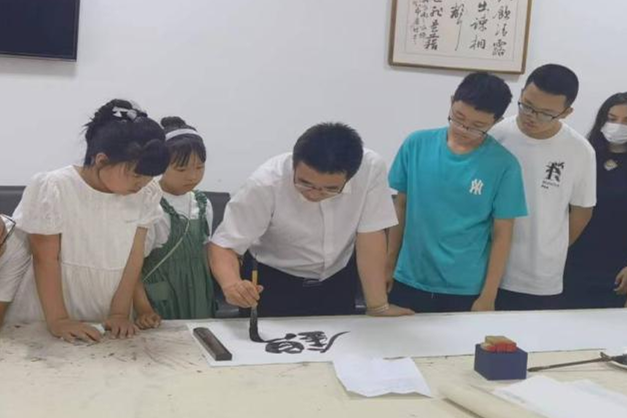 在美术馆展馆,恰逢“喜迎党的二十大 庆祝建军95周年”美术书法作品展览,同学们更是赞叹书画作品的艺术魅力。美术馆馆长、市书法家协会主席董庆林亲切与同学们交流互动,现场教授书法心得,并为本次活动主题题字。